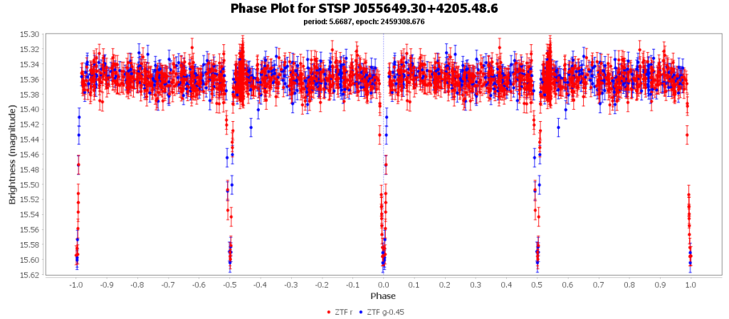 | J2000.0 | 05 56 49.30 +42 05 48.6 | Mag. range | 15.36 - 15.59 r |