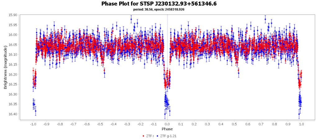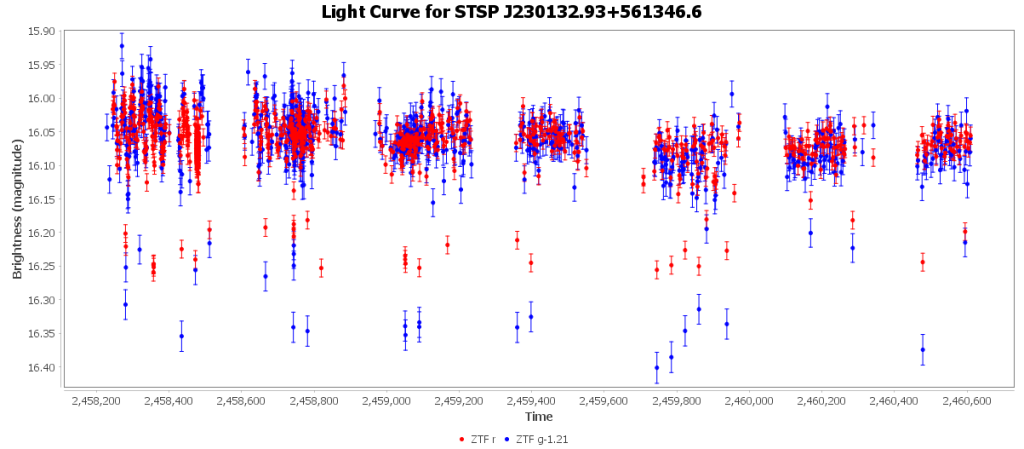 | J2000.0 | 23 01 32.93 +56 13 46.6 | Mag. range | 15.98 - 16.25 r |