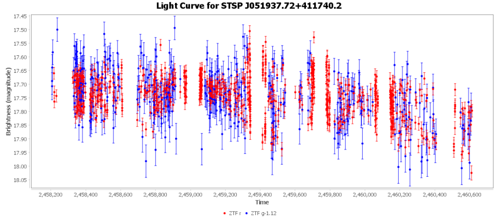 | J2000.0 | 05 19 37.72 +41 17 40.2 | Mag. range | 17.55 - 17.95 r |